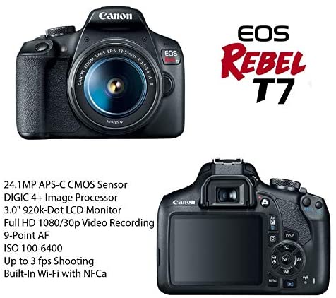 The EOS Rebel T7 DSLR Camera from Canon has a 24.1MP APS-C CMOS Sensor and DIGIC 4+ Image Processor. It has a 3.0″ 920k-Dot LCD Monitor with Full HD 1080/30p Video Recording capabilities. It offers sharp details, accurate colors and low-noise imaging in both bright and low-light shooting situations. The Rebel T& can continuously shoot up to 3 fps.