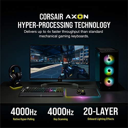 Powered by Corsair AXON Hyper-Processing Technology, enabling Corsair’s most advanced gaming keyboard experience by delivering up to 4x faster throughput with native 4,000Hz hyper-polling and 4,000Hz key scanning, while simultaneously driving up to 20-layer lighting effects