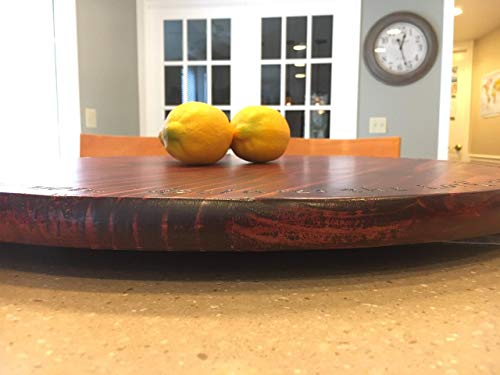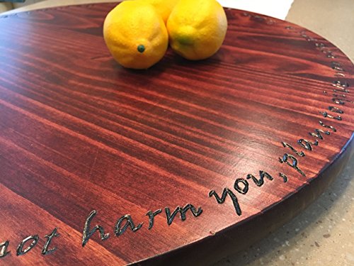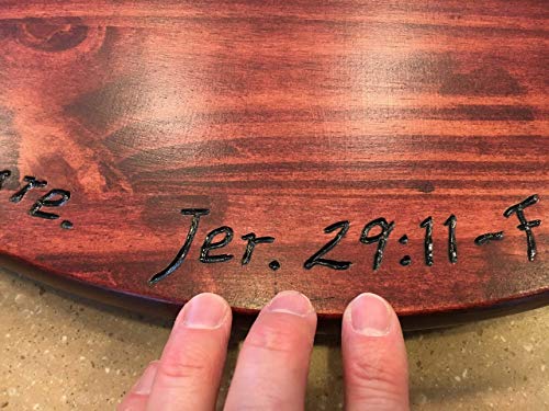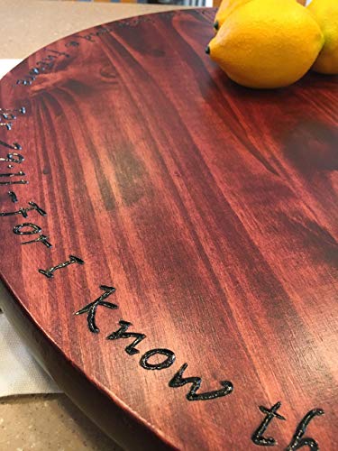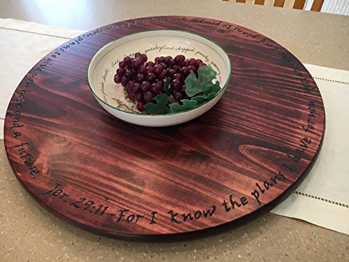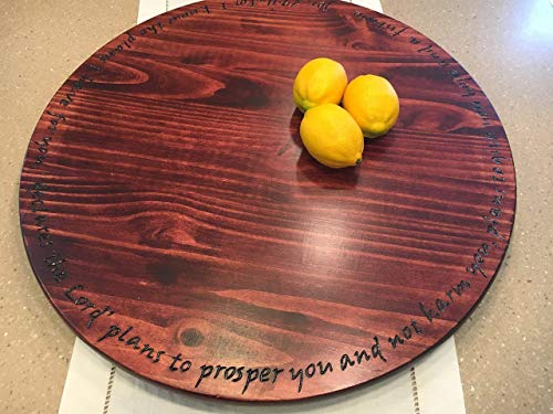 Customize your own Lazy Susan with your special verse, quote or inspirational saying. The one shown in the photos is 24″ in diameter, is made of solid wood and has hand carved verse on the outside edge ‘Jeremiah 29:11’ (1-line of 130 characters). I can accommodate custom orders with your chosen verse or inspirational quote to fit 24″ diameter…and custom stain colors. Not exactly what you’re looking for ? Just send me a note of what diameter, verse and color you want, and I can walk you through the ordering process to create a quote for your special customized Lazy Susan. I carve the letters by hand; not a laser etching, machine routered or stamped with a punch. But each letter is carefully carved into the wood surface, creating a wonderful look. You can enjoy reading scripture or inspirational verse as it spins! I build each lazy Susan starting with a round blank of wood which is sanded smooth on the top, bottom and edges. Then, I set to work on carving the letters. This takes many hours to carefully layout the words and adjust the spacing of each letter. After carving, each letter is hand painted with an oil-based paint. Finally, after all this is done, I apply several coats of clear polyacrylic sealer which is hand polished to a nice satin sheen. This creates a surface that is waterproof and tough! For the rotating base underneath, I use the highest quality turntable available, for a smooth spinning action. This is mounted on a square base which is covered with a soft, foam pad to protect your table surface from scratching. The lazy Susan shown in the photos is stained and is 24″ in diameter and approximately 2″ tall. This is a single line with 130 character spaces (letters plus spaces between letters).