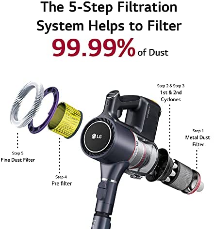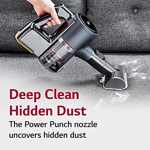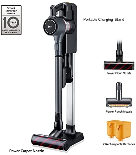 Control your clean with the LG Cord Zero A9 Stick Vacuum, thanks to two quick release batteries that deliver superior runtimes. The Power Punch Nozzle helps remove hidden dirt for deep cleaning, one touch control makes cleaning a breeze, and a portable charging stand lets you store and charge anywhere, anytime. Even maintenance is easy, with removable, washable filters and cyclone system. Noise: 84 dB.