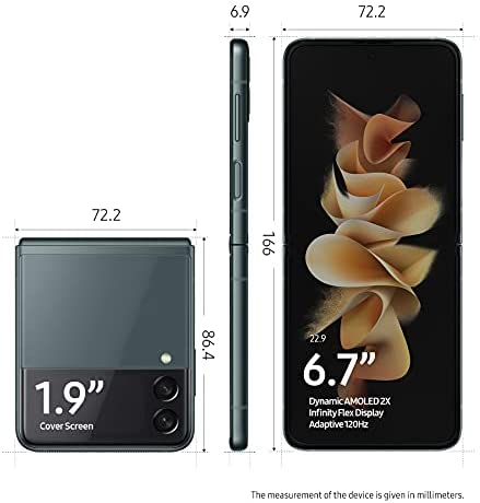 The Samsung Galaxy Z Flip3 5G cell phone gives you the freedom to capture from any angle. Make hands-free video calls and take photos by simply unfolding your Galaxy Z Flip3. Need to edit your next viral video? Flex Mode allows you to play it back on the top screen, while your bottom screen gives you pro editing control. With hands-free chatting, your phone stands on its own without sliding off the surface it’s propped on or leaving your friends talking to the ceiling. Just flip your smartphone open halfway, set it down and do your thing. Portrait Mode takes studio-like portraits with enhanced AI processing, allowing you to change up your background and lighting effects to naturally blend together. Plus, Hyper-Lapse and Auto Framing make it easy to capture your best shot in the first take. Compact with a 6.7” flexible display, you can fit the phone into your pocket. Complete your look with statement-making color choices: Phantom Black, Lavender, Green or Cream. Each adds a pop of personality that’s uniquely you. Blast through a single charge with 15W fast charging. Galaxy Z Flip3 notifies you on the external cover screen, so you can view notifications and check the weather. Launch up to two apps simultaneously. Galaxy Z Flip3 is equipped with 5G and our fastest Galaxy processor to date. Water resistant and framed with Armor Aluminum, our strongest aluminum yet, it’s the phone that endures your busiest days and wildest nights. Unfold a new world of benefits with exclusive Z Premier perks. Super Steady video is limited to 1080p resolution at 30fps. Display measurements are diagonal, and actual viewable area is less due to rounded corners and camera hole punch. Fast (15 W) charger sold separately. Use only Samsung approved chargers and cables; do not use any worn or damaged chargers or cables; incompatible charger or cable can cause serious injuries or damage to your device. Multi-active window works with select applications; compatible apps growing through third party developers. 5G speeds vary and require optimal network and connection (Factors include frequency, bandwidth, congestion); see carrier for available. Has an official IPX8 rating. Water resistant in up to 5 feet of freshwater for up to 30 minutes. Rinse residue/dry after wet.
