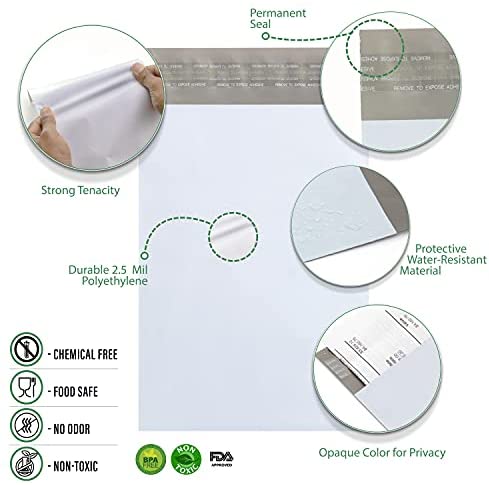 WHITE OPAQUE POLY MAILER ENVELOPES BY GPI Our bags are made with premium grade all-virgin polyethylene (LDPE) & are designed to meet exceptionally high criteria. These sealable apparel bags are extremely versatile and great for storage, packaging & shipping. (great for Amazon FBA!) Our bags are able to withstand the unpredictable mailing & shipping process. Peel & seal – simply peel away the plastic strip from the adhesive and press the flap onto the bag. Usable size: 5″ x 7″ measured from below the hoodie flap. Thickness: 2.5 mil REDUCE THEFT: Our bags feature a powerful, permanent adhesive seal that cannot be opened or reseal once sealed without noticeable damage to the bag. These first class mailers feature a black or silver/gray inner lining to protect privacy. NOTE: These bags are unpadded & are for non-fragile items only, it would be best to go with boxes or bubble mailers for fragile items. Excellent for packaging & shipping apparel shirt, tshirt, cloth, garment, sweater, catalog, t-shirt, clothes & much more. Being in this industry since 1997, having provided thousands of customers around the world with a consistency they can trust- we have developed an eye for the details that make a product stand out. As the sole manufacturer of our poly bags, we maintain full control over the quality standards and throughout the years our goal is to turn you from just a customer, to a proud member of the GPI family. Eliminate the Guesswork & Go for What You Trust- Click Add to Cart Today.