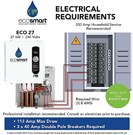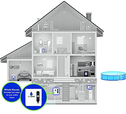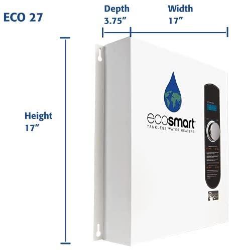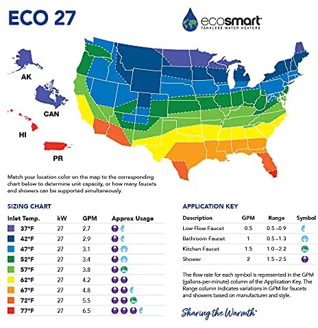 EcoSmart ECO 27 Sizing; 27-kilowatt tankless electric water heater ideal for providing hot water for whole home applications; provides between 2.7 and 6.5 gallons-per-minute depending on the inlet water temperature; refer to the sizing guide to select the proper solution