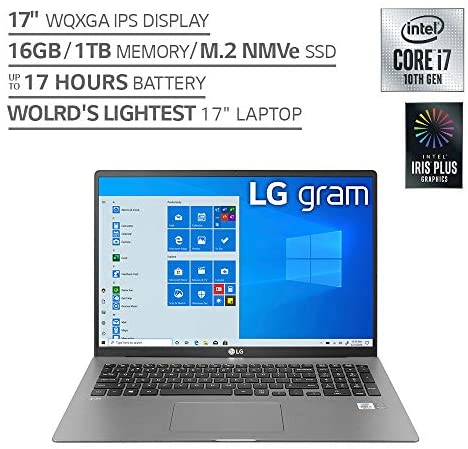 Deliver necessary portability with uncompromising features on the new for 2020 LG gram 17Z90N It has a huge 17-Inch WQXGA (2560×1600) IPS display while still slim and light enough to take anywhere At under three pounds and delivering 17 hours of battery life* this LG gram is great to carry around for a long day of work The 17Z90N also impresses with an Intel 10th Generation i7-1065G7 CPU with Iris Plus graphics 16GB RAM a 1 TB M 2 NMVe SSD and USB Type-C connectivity *MobileMark 2014 standard (MobileMark is a trademark of the Business Applications Performance Corporation) Performance level is utilized for comparison purposes only and does not necessarily reflect the battery life that will be achieved Actual battery life will vary from specifications depending on model setup configuration applications used features utilized and power management settings