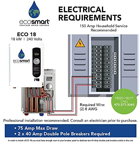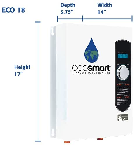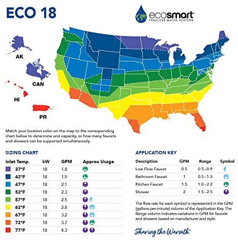 This Smart Technology electric tankless water heater is configured for climates where incoming water temperature is 62 Degree F and above. The ECO 18 is capable of heating over 2.5-Gallon per minute, which is the equivalent of one shower head (with a 1.5 gpm flow) and one sink with a low inlet water temperature of 62 Degree F. Two showers can be run simultaneously when incoming water temperature is above 70 Degree F in warmer climates such as South Texas, South Florida, New Mexico, Arizona and South California. These models come with a digital temperature control that allows you to set your temperature in increments of 1 Degree. Prior to purchase and installation please verify this model is the rights size for your hot water needs and electrical requirements.