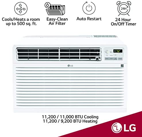 The LG 11, 200 BTU 230V through-the-wall air conditioner with 11, 200 BTU supplemental heat function gives you everything you love about an air conditioner and more! whether it’s cold in April or hot in October, this unit has you covered so you can always feel comfortable at home. In addition to cooling, this versatile unit offers supplemental heating, providing you with an additional heat source to your main heat source when outdoor temperatures are above 45 degrees Fahrenheit. Please note: this unit is designed for through-the-wall installation and is not designed for standard window installation. It has a universal fit for existing, standard 26-Inch wall sleeves (new wall sleeve sold separately). this unit also requires a special 230-volt/20-amp electrical Outlet and will not operate with a standard 115V household electrical Outlet.