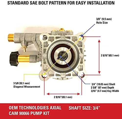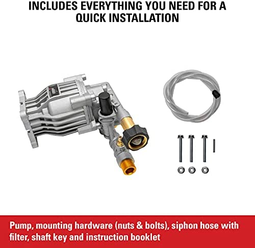 Easy Installation: This replacement pump features a garden hose inlet and threaded M22 connection high pressure hose outlet. The SAE standard bolt pattern that fits most* gas-powered pressure washers. Each kit includes a siphon tube with filter, mounting bolts, shaft key, and instruction booklet to get your machine back in action as quickly as possible. (*Check your pressure washer’s inlet and outlet orientation to ensure compatibility)
