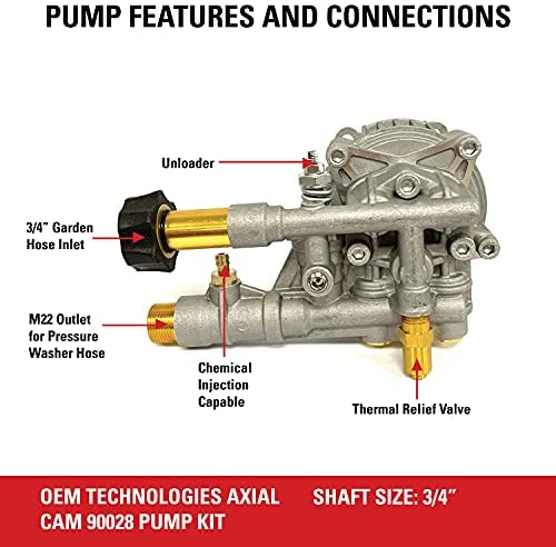 Designed for performance, the 90028 OEM Technologies Axial Cam Pump is highly efficient and minimizes engine load. This easy-to-install pump replacement kit is for gas pressure washers* with a horizontal engine and a 3/4″ diameter shaft, such as Kohler SH270 and Honda GC160/190. This pump can produce up to 3300 PSI at 2.4 GPM. The 90028 has stainless steel pistons for improved seal life and features a stainless steel integrated unloader with our easy-start system. (*Check your pressure washer’s inlet and outlet orientation to ensure compatibility)