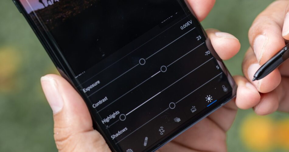 Closeup of a Samsung Galaxy Note 10+ with settings in Lightroom Mobile on display
