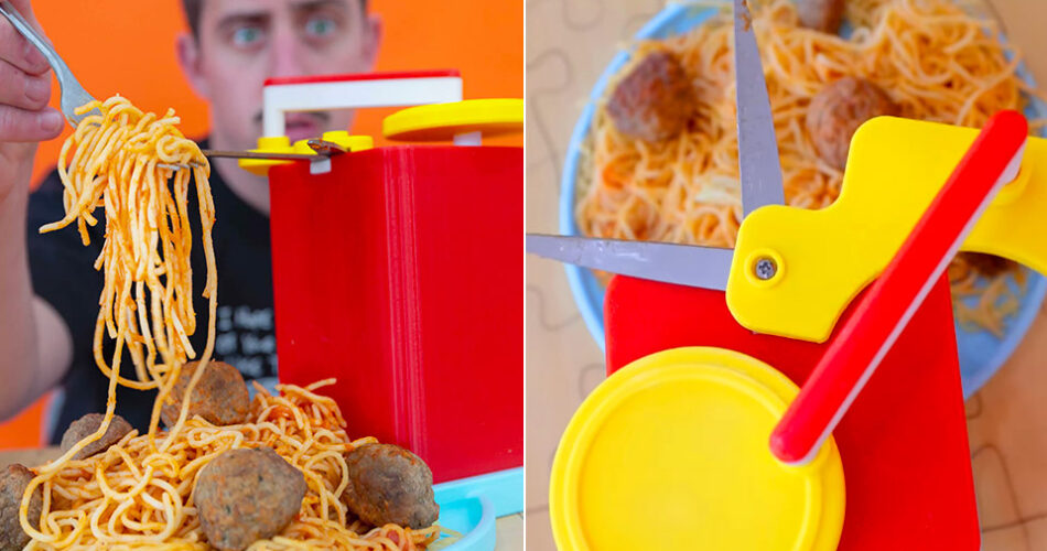 So at your next Italian feast, thoughtlessly grab your pasta and raise it between the moving blades to crop the excess noodles from below your fork to finally stop slurping,” said Matty.
