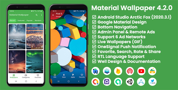 Material Wallpaper v4.2.0 - Android Studio Arctic Fox | 2020.3.1 Patch 2 - Update Gradle 7.0 - Migrate jCenter to mavenCentral - Min SDK version 21 (Lollipop) - Add New Ad Networks option (AppLovin's MAX & Mopub) - Audience Network Open Bidding (AdMob, AppLovin's MAX or Mopub) as Mediation Partner - Fix Wallpaper not saved / shared on Android 11 or above Material Wallpaper v4.1.0 - Build in latest Android Studio 4.1.3 - Fix false display category name when click wallpaper notification - Add Category search - Always display Native Ads in full width in the grid wallpaper - Add Native Ads in wallpaper slider - Add App Open Ads (AdMob Only) - Simple UI Mode (Homescreen without Scrolled Tab) - Add option to change Category as main screen - Bulk delete wallpapers in the admin panel - In-App Review - Custom font - Fix API access issues on VPS or Nginx servers that are not directly supported with .htacces Material Wallpaper v4.0.0 - Build in latest Android Studio 4.1.1 - Update Gradle 6.5 - Update targetSdkVersion 30 - Update minSdkVersion 19 - UI/UX Design Improvement - Bottom Navigation - Dark Mode Added - Live Wallpaper support (GIF format) - Using Retrofit instead of Volley for API Requests - Supports 4 Option Ad Network (AdMob, FAN, StartApp, Unity Ads) - Ad Network is managed from admin panel (Remote Ads) - Replace AdMob smart banner to adaptive banner - Shimmer Effect on Refresh - Improved display in RTL mode - Purchase Code verification Improvement - Fix minor bugs Material Wallpaper v3.1.0 - Build in latest Android Studio 3.5.0 - Update to latest Gradle Tools and Library - Update targetSdkVersion 29 - Migrate to AndroidX - Multidex Enabled - Set Wallpaper with other apps (Optional) - Fix the privacy policy form that doesn't appear in the admin panel settings menu. Material Wallpaper v3.0.0 - Build in latest Android Studio 3.4.2 - Update to latest Gradle Tools and Library - Update HTTP URL for APIs Connection to Volley Library - Set Wallpaper as Home Screen, Lock Screen or Both - Add Featured, Popular & Random Wallpaper - Add Wallpaper View Count & Download Count - Add Load More Pagination - Add Search Menu - Add Wallpaper Tags - Add Wallpaper from External URL - Fix Bugs and Performance Improvement Material Wallpaper v2.5.0 - Build in latest Android Studio 3.2.1 - Update to latest Gradle Tools and Library - Update to latest AdMob library - Update targetSdkVersion 28 - Bring back OneSignal Push Notification - Push Notification can be sent from Admin Panel directly - Push Notification have ability to open url Material Wallpaper v2.4.0 New Features and Improvement - Build in latest Android Studio 3.1.3 - Update to latest Gradle Tools and Library - Update targetSdkVersion 27 - Update ListView to RecyclerView - Update Json API - Material Design UI Improvement - Admin Panel UI Improvement - Comply with GDPR Policy for EEA (European Economic Area) country - Interstitial Ad Interval - Add Tab Layout - Add dialog when close the app - Zoom Wallpaper in detail wallpaper - Fix NullPointerException - Fix crash app on share menu on Android O - Fix bugs and performance improvement Removed Features : - Eclipse Project Removed (Deprecated) - Onesignal Removed - Slideshow Removed Material Wallpaper v2.1.2 - Build in latest version of Android Studio and Eclipse - Update additional libraries to the latest version - Add File Access Permission on Android Marshmallow 6.0 or higher - Firebase Push Notification (Android Studio) - Firebase Analytics (Android Studio) - OneSignal Push Notification (Eclipse) - Floating Action Button on wallpaper gallery - Redesign Admin Panel Dashboard with Material Design UI - Fix bugs and performance improvement Material Wallpaper v2.0.0 - Build in latest Android Studio and Eclipse - Update additional libraries to the latest version - Add compatibility on Android Marshmallow 6.0 - Google Analytics is Available Now - Add New Settings Menu in Android App - Fix showing images on gallery when save wallpaper - Navigation Drawer with Header Image - Improvement thumbnail image quality - New Application Logo - Migrate Push Notification from Parse to GCM - Send Push Notification directly from Admin Panel Material Wallpaper v1.2.0 - Bulk Image Upload Now Available - Eclipse Project Version Now Available - Easy Enable or Disable AdMob - Placing AdMob according new Google AdMob Policy Recommendation