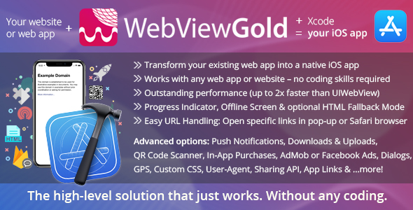 WebViewGold is an innovative no-code WebView app template for Xcode designed to make things easier for you: Create your own apps for iOS easily using your existing web apps. Create your own apps for iPhone & iPad with just a few clicks and without any understanding of code. Use your mobile web app as the basis, and the WebViewGold app template wraps your URL content into a real, native iOS app! No more coding, no more plugins needed, it just works.