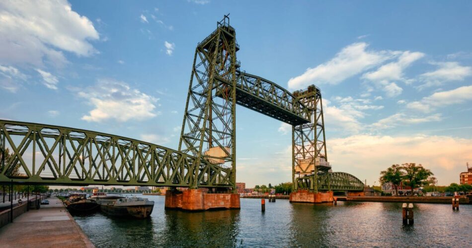 The monument to excess is too large to safely fit beneath the steel lift bridge, which was bombed during the Second World War then restored so trains could run over it. These days it’s an iconic piece of the Rotterdam skyline, having fallen out of rail use in the early ’90s.