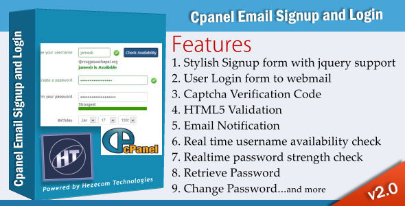 This script is a simple php script that allow your clients to register free email for themselves without them having access to the cpanel. When user signup the detailed info of the user will be saved to your database and the username and password provided by the user will be used to create email on the cpanel. This email signup form works like gmail, yahoo… signup. Everything happens once at the click of the submit button.