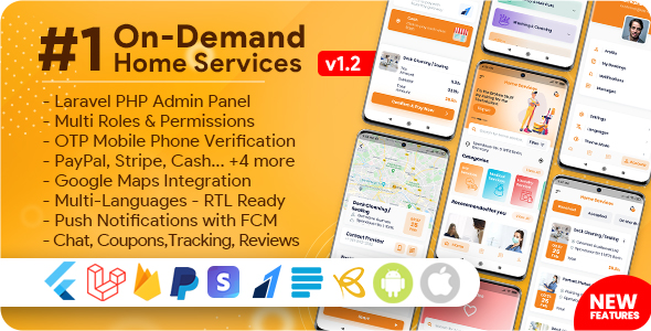 V1.2.5 | 10-01-2022 - Customer Mobile Application ( Flutter version 2.8.1 Stable Release & Android SDK 31) Fix payment details screen Fix internal bugs and errors Update dependencies & flutter 2.8.1 to support Android SDK 31 - Admin Panel Application ( PHP Version 7.2 or Higher) Fix APIs to adapt with customer website: https://1.envato.market/home-services-web Fix data-tables sort items Fix internal bugs and errors