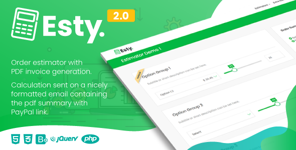 is a multipurpose, 100% responsive, simple and clean cost estimator built with HTML5, CSS3, jQuery using Bootstrap4. With its PHP engine Esty is able to generate PDF summary about the order