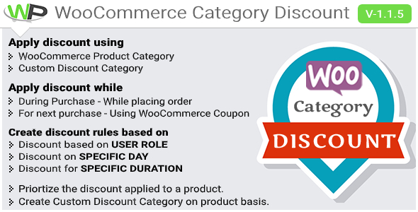 WooCommerce Category Discount plugin allows you to manage discounts for your WooCommerce store. It is important that you strategically create rules for discount offers. In addition, things get complicated when you have multiple products and you want to offer discounts based on multiple parameters. WooCommerce Discount Category plugin offers well-defined solutions to help you set the discount rules for your store.