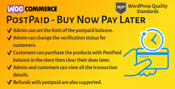 WooCommerce PostPaid module allows customers to purchase products from your store without actual paying upto the limit set by Admin and then they can clear their dues later. Admin can set the limit of PostPaid balance which can be used by the customers on the store purchase.