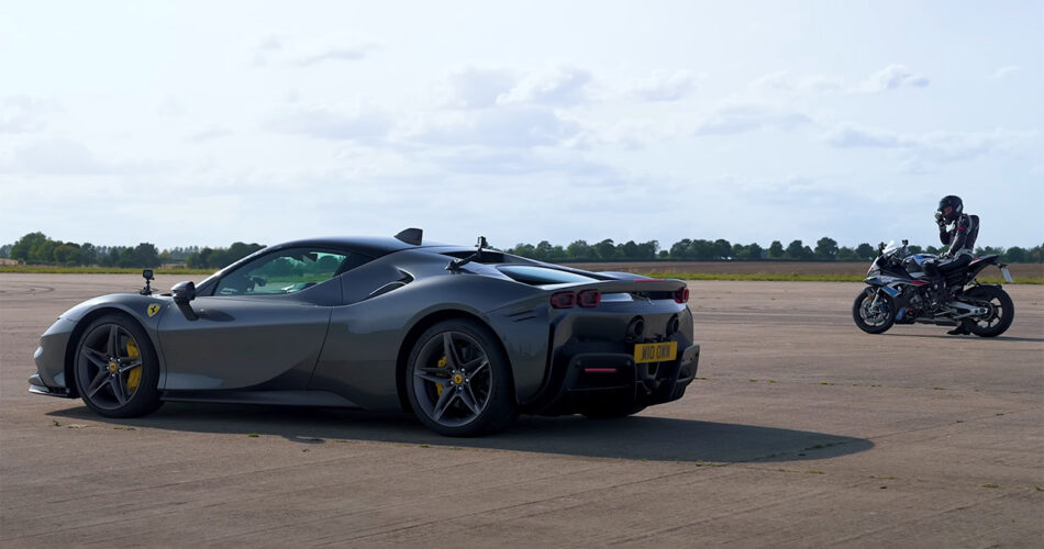 Can a Ferrari SF90 Stradale beat a BMW M 1000 RR in a drag racing showdown? CarWow wanted to find out so they pit the supercar against the superbike in a race to see who would come out on top. The former is powered by a twin-turbo 4.0L V8, paired with three electric motors, that generate a combined 986 hp and 590 lb-ft of torque.