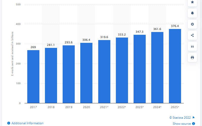 The success of email marketing has led to an increase in the number of emails sent and received globally. The figure has increased each year since 2017 and is expected to reach 376 billion emails by 2025.
