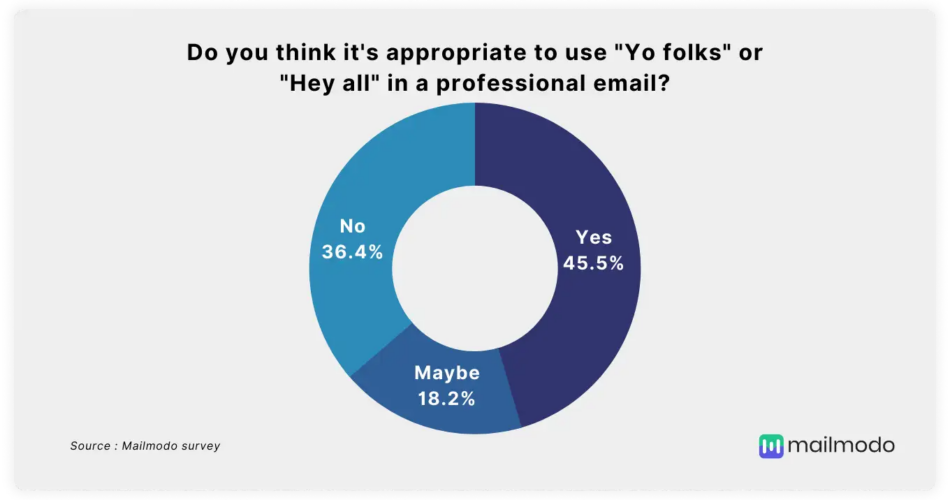 When we surveyed a few working professionals, we found that nearly 46% of individuals find it appropriate to use casual salutations like “Hey all” and “Yo folks.”