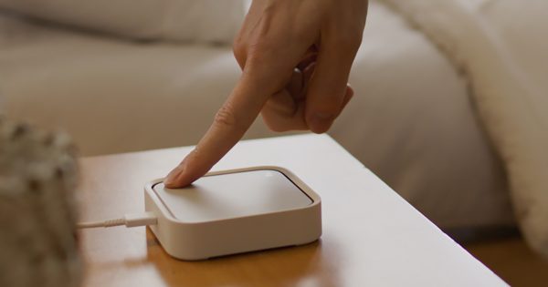 Speaking of button, the Station has a button embedded within it that triggers routines like I just mentioned. This button can perform separate routines for short, long, and double presses. In the image above, you can see someone pressing the device’s button.