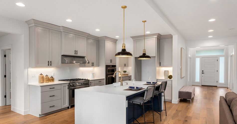 A modern open-concept kitchen with recessed lighting.