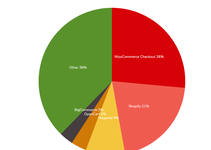 WooCommerce is the most popular ecommerce solution. According to Builtwith, it’s on 23% of websites using ecommerce technologies: