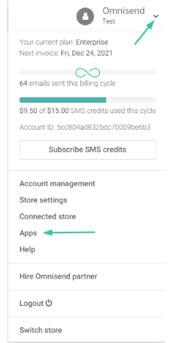 Step 2: To attach your app to Omnisend’s platform, click on in your model title within the high proper nook and open the Apps tab.