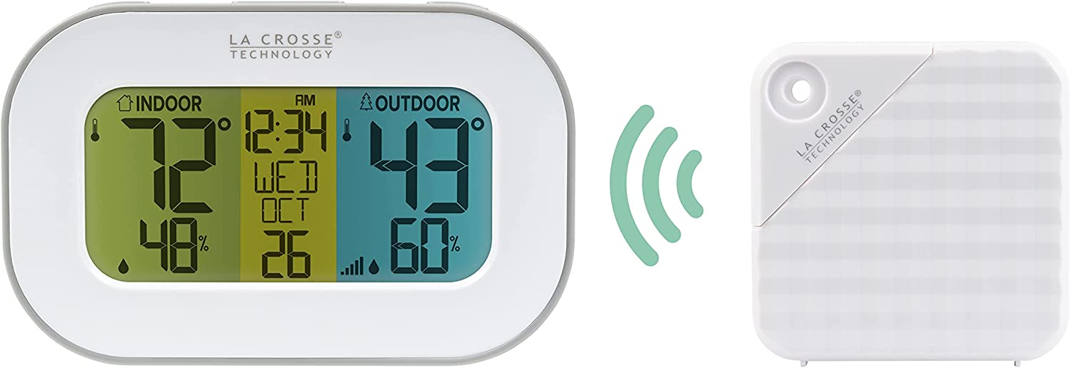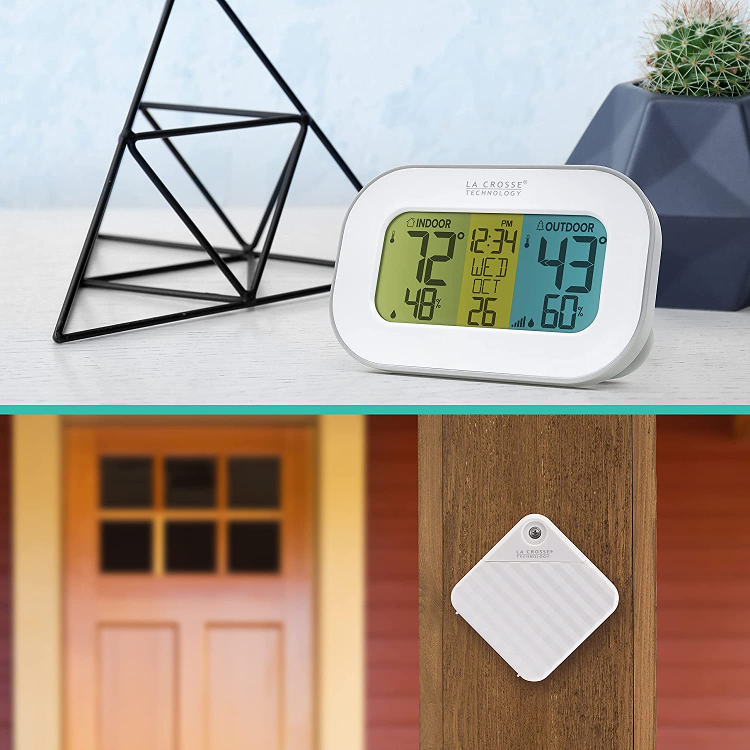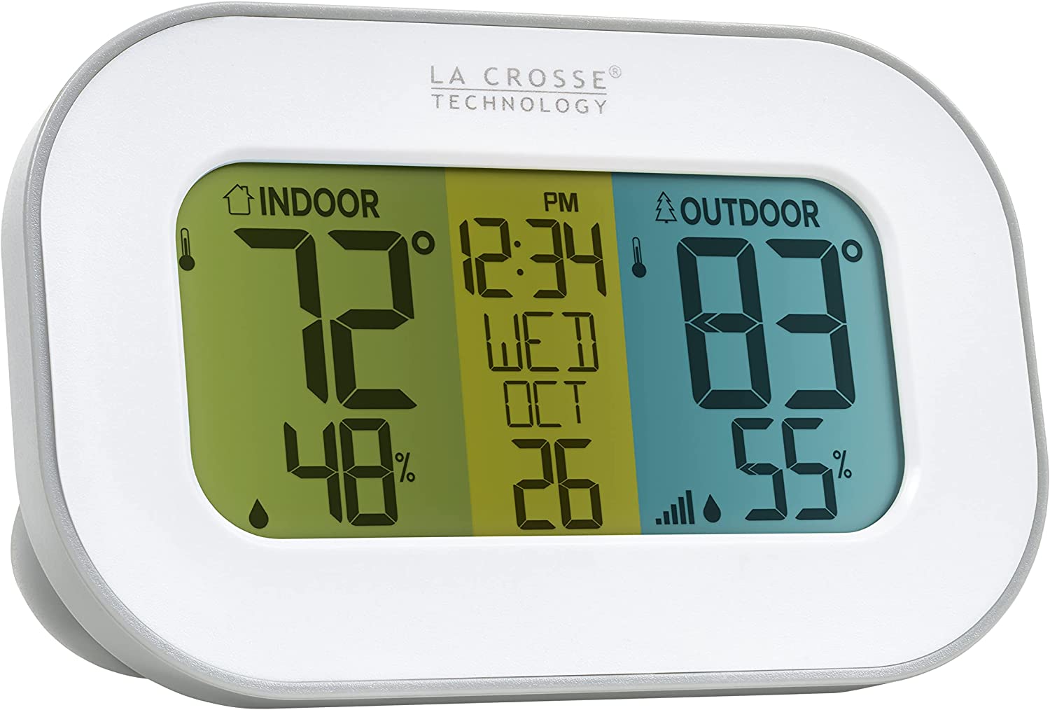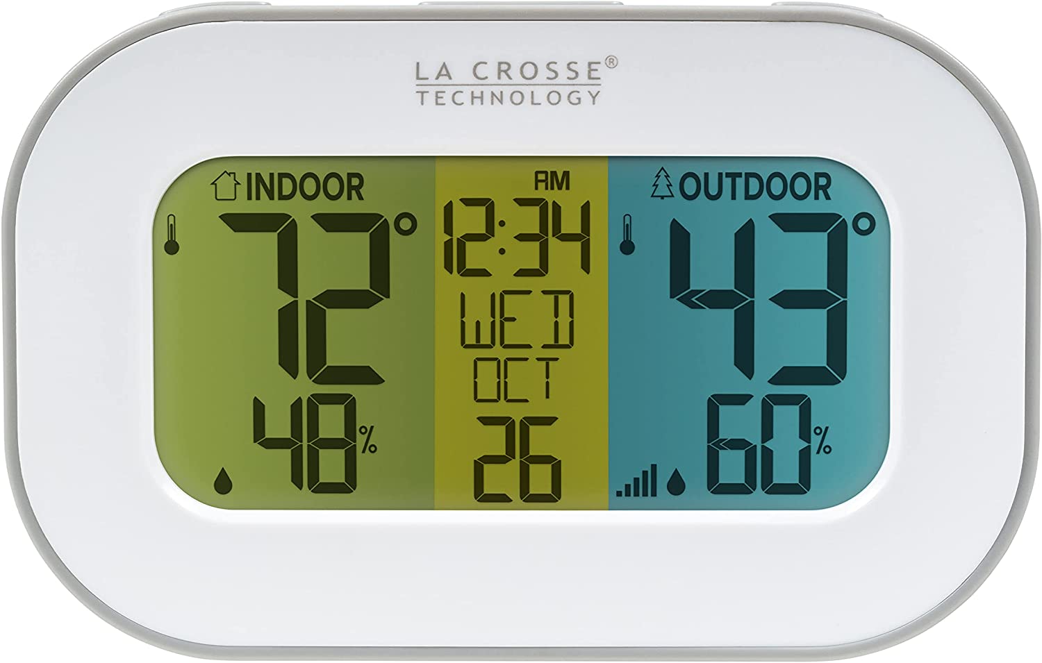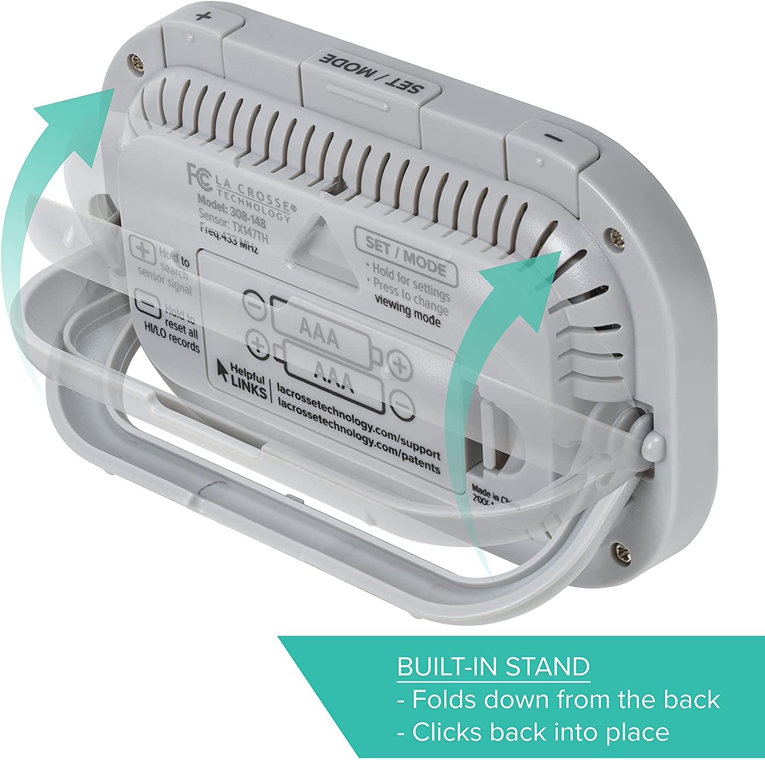 Shows indoor and outside temperature (°F/°C) & humidity (%RH) with HI/LO data and time with date stamp