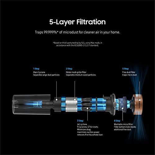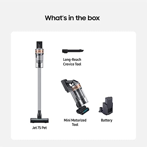 The Samsung Jet™ 75 Pet Cordless Stick Vacuum affords highly effective cleansing efficiency and a light-weight and maneuverable design. Detachable, rechargeable battery affords as much as 60 minutes of run time, and the Digital Show options 4 cleansing modes. 5-Layer filtration captures pet dander, pollen and different nonliving particles for cleaner air in your house. The filter system picks up giant clumps of nice particles, captures nice particles and traps 99.999%** of microparticles. Digital Invertor Motor generates intense suction energy as much as 200AW to simply raise filth out of your flooring. Jet Cyclone know-how optimizes airflow, pulling filth by way of the vacuum into the high-capacity filth bin. Clog-reducing Jet Cyclone know-how offers constant, highly effective suction to maintain filth from increase on the filter.*** The 0.8-liter excessive capability filth bin collects extra filth so that you don’t must empty it as typically, and is absolutely washable, making cleansing it a snap. Additionally it is appropriate with the Clear Station which empties the dirtbin on the press of a button for a past the ground clear. Will we not wish to name out the pet instrument and different equipment right here like we did for the Jet75 full? *Acknowledged run time applies to the minimal energy stage with a nonmotorized instrument connected. Second battery offered individually. **Primarily based on third-party testing by SLG, utilizing Max mode, in accordance with the IEC62885-2 CL5.11 commonplace. ***Primarily based on inner testing.
