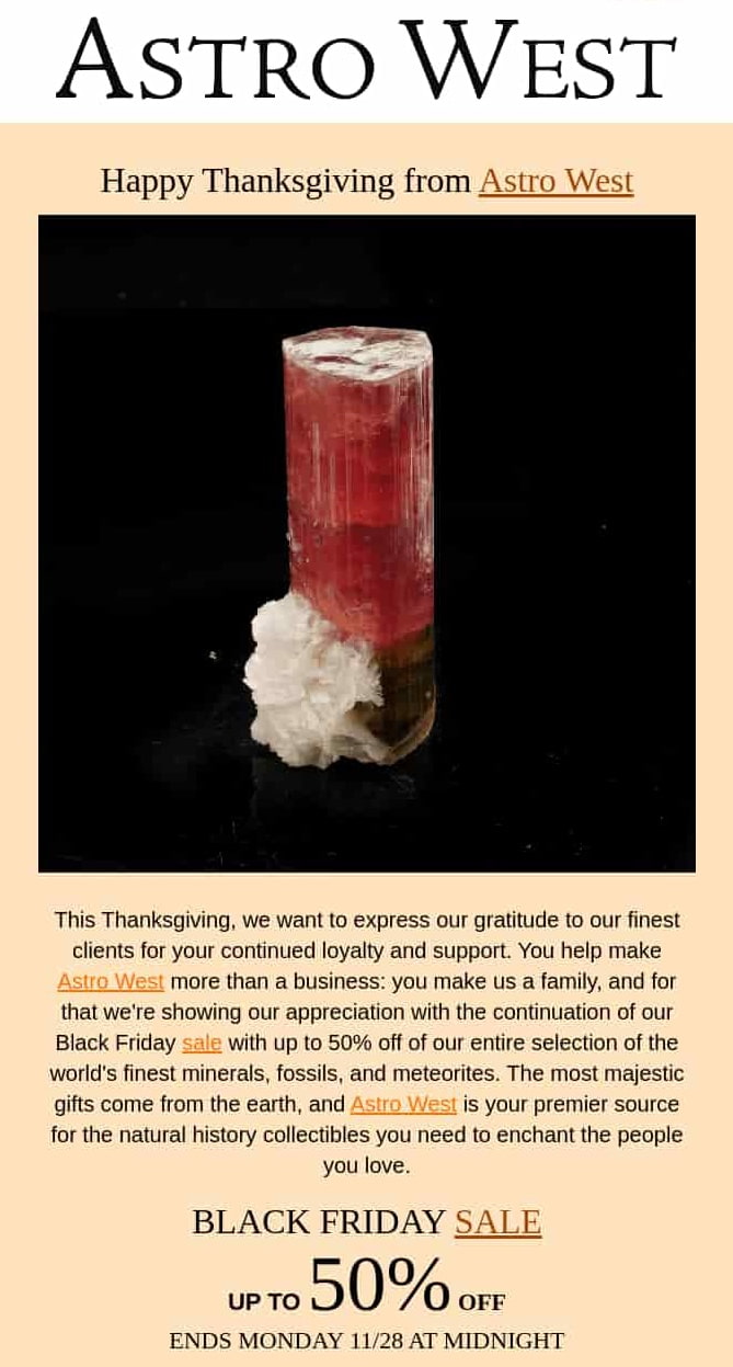 This Astro West advert stands out as a result of it begins by thanking customers after which positions the sale as a type of gratitude. It has some nice strains, together with “You assist make Astro West greater than a enterprise: you make us a household,” which create a bond with readers and result in an genuine really feel in comparison with adverts which are solely in regards to the sale.