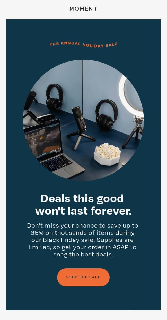 This Moment marketing campaign is one other instance of making urgency and stoking FOMO with out being too aggressive with language or visuals. Utilizing the heading “Offers this good gained’t final eternally” highlights how good of a possibility the sale is and begins an inner countdown in readers’ minds.