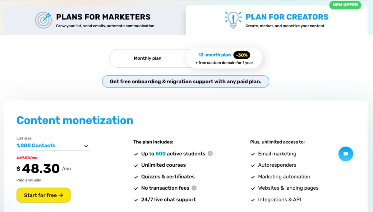 GetResponse’s content material monetization platform begins at $48.30 per thirty days. This offers you entry to the course creator, the place you may construct limitless programs! You’ll additionally achieve limitless entry to our advertising options, together with e mail advertising, autoresponders, touchdown web page and web site builders, and advertising automation.