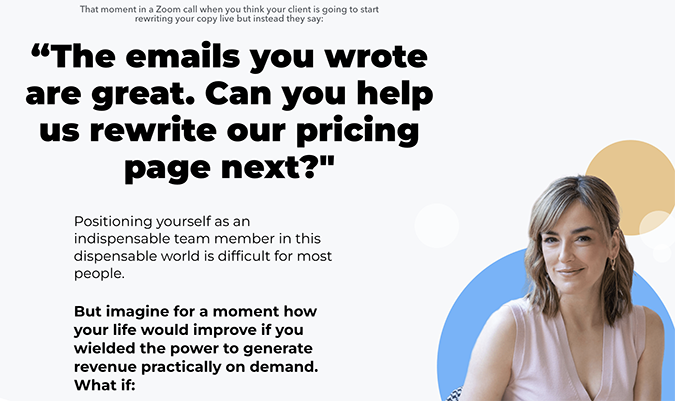 Proper from the get-go, it begins with a headline that guarantees aspiring copywriters a constructive change of their working expertise, adopted by a robust paragraph that instantly captures your consideration: “However think about for a second how your life would enhance for those who wielded the ability to generate income virtually on demand.”