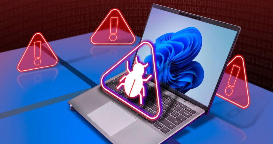 Illustration of a laptop with some warnings, danger icons, viruses around, and some indications that they are fake. Lucas Gouveia / How-To Geek | Vector Dude / Shutterstock