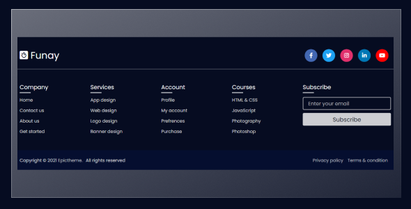 Funay – Css3 Trendy Footer, there’s 1 kinds of artistic model with CSS3 animation. You should utilize it in your web page or anyplace in your challenge. Clear and stylish for each artistic folks, corporates, company, e-commerce, enterprise, portfolio and so on. That is completely customizable and ready to make use of throughout a number of easy steps by selecting the precise part that you simply want to use. HTML5 and CSS3 recordsdata space unit legitimate and nicely commented.