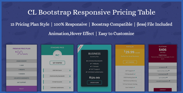 CL Bootstrap Responsive Pricing Desk – is essentially the most full and totally featured pricing desk construct with Bootstrap framework. It’s has been 15 Distinctive Fashion with totally different shade mixture. It’s nicely documented that’s why you should use this pricing desk in your venture simply. Simply copy the HTML code to your web site and hyperlink to the CSS and JS recordsdata.