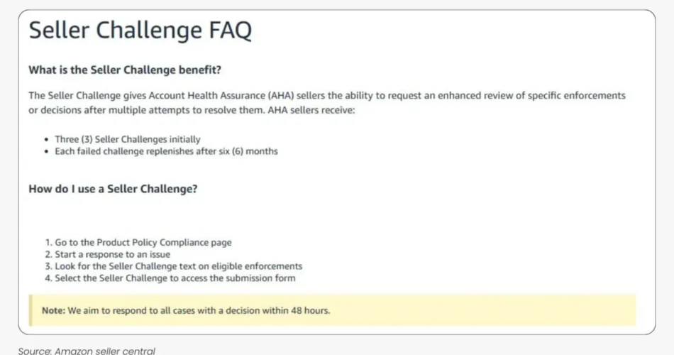 The Vendor Problem program operates via a tiered construction designed for Account Well being Assurance members. Based on the FAQ documentation, eligible sellers obtain three preliminary challenges. Every failed problem replenishes after six months, making a renewable allocation system. The method requires sellers to provoke challenges via the Product Coverage Compliance web page by responding to a difficulty, finding Vendor Problem textual content on eligible enforcements, and choosing the choice to entry the submission kind.