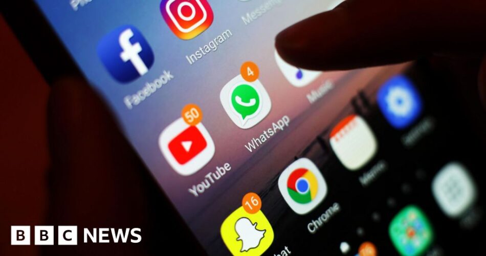 PA Media A phone screen showing some popular social apps, including WhatsApp, YouTube and Snapchat. A thumb hovers above the WhatsApp icon.PA Media