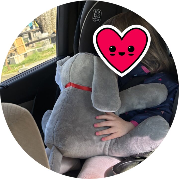 Proper earlier than scripting this publish, I visited the household and introduced Bother. I knelt down at her stage and held the plush canine behind my again.