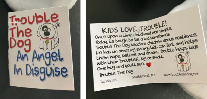 “It was their son’s thought,” says Sheila, “as a result of he is aware of what it’s like. He needed youngsters to have the consolation of Bother once they had been transferring from place to put.  He at all times says, ‘Individuals must know Bother is a magical Canine.’”