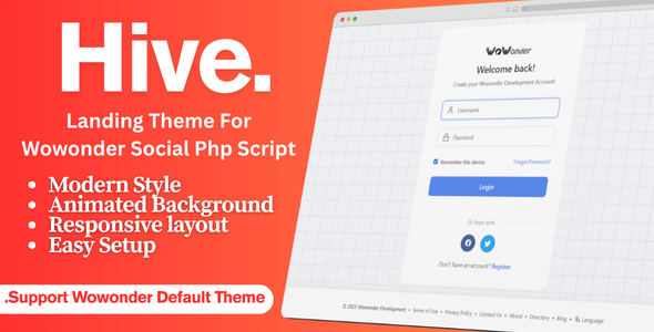 Hive Touchdown Theme is an unique design for Wowonder Social Script customers. This premium touchdown web page incorporates a fashionable animated background, glossy kind designs with icons, responsive format, password restoration choices, and constant styling throughout all pages.