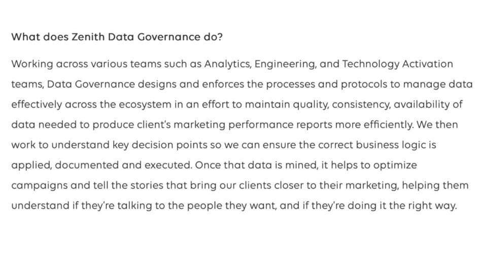 Zenith’s Director of Data Governance position, posted on November 6, 2025, displays a elementary shift in how media companies construction their operations. The function requires experience in digital marketing campaign mechanics, analytics, and regulatory compliance—a mix discovered primarily amongst professionals with programmatic promoting backgrounds. Compensation ranges from $120,000 to $157,000 yearly for positions in Detroit and New York.