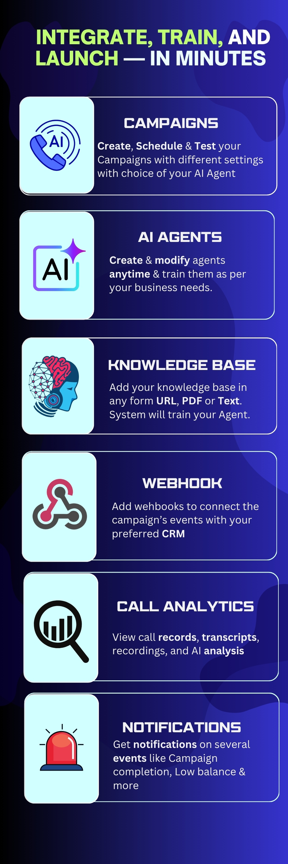 - Occasion Invites: Invite contacts to webinars or launches with conversational voice calls.