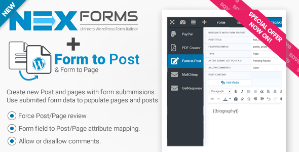Allows the power to create posts or pages from any kind constructed with NEX-Varieties. Contains WP web page/publish settings in addition to setting featured photographs for posts or pages from a mapped file add area!