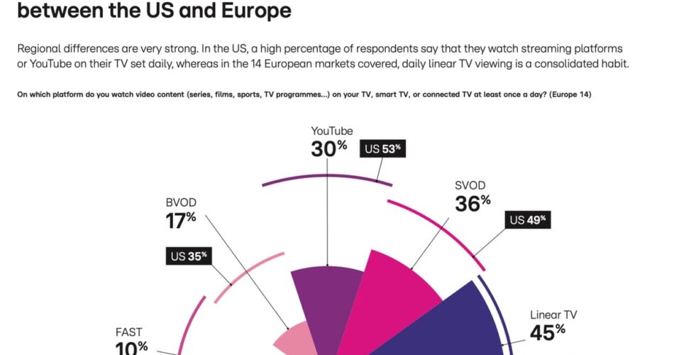 Every day attain figures exhibit tv’s continued skill to mixture audiences. Portugal exceeds 80 p.c each day attain for linear tv, whereas France achieves 73.7 p.c each day attain. The UK sits nearer to 55 p.c each day attain. Every day attain in most markets defines as one consecutive minute of viewing time throughout a day.