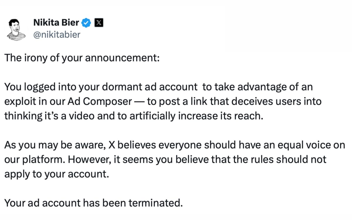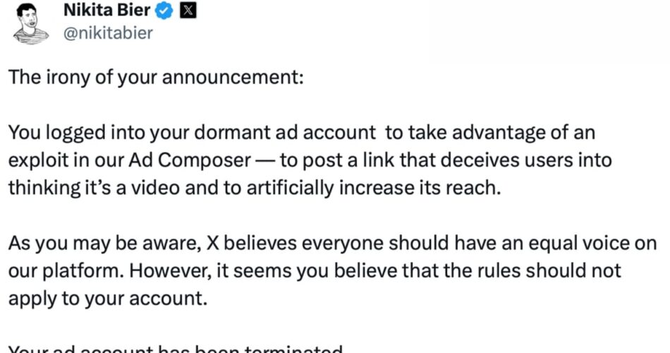 Nikita Bier, X’s head of product, announced the termination in a response to the Fee’s announcement of the advantageous, in keeping with a put up on X. “The irony of your announcement: You logged into your dormant advert account to make the most of an exploit in our Advert Composer — to put up a hyperlink that deceives customers into considering it is a video and to artificially improve its attain,” Bier wrote.