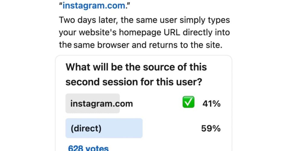 In response to the poll, Wrodarczyk requested members to foretell session supply attribution when a consumer visits an internet site from Instagram, then returns two days later by typing the URL instantly into the identical browser. The vast majority of respondents chosen “(direct)” because the session supply, whereas the right reply was “instagram.com” primarily based on Google Analytics 4’s final non-direct click on attribution mannequin for session sources.