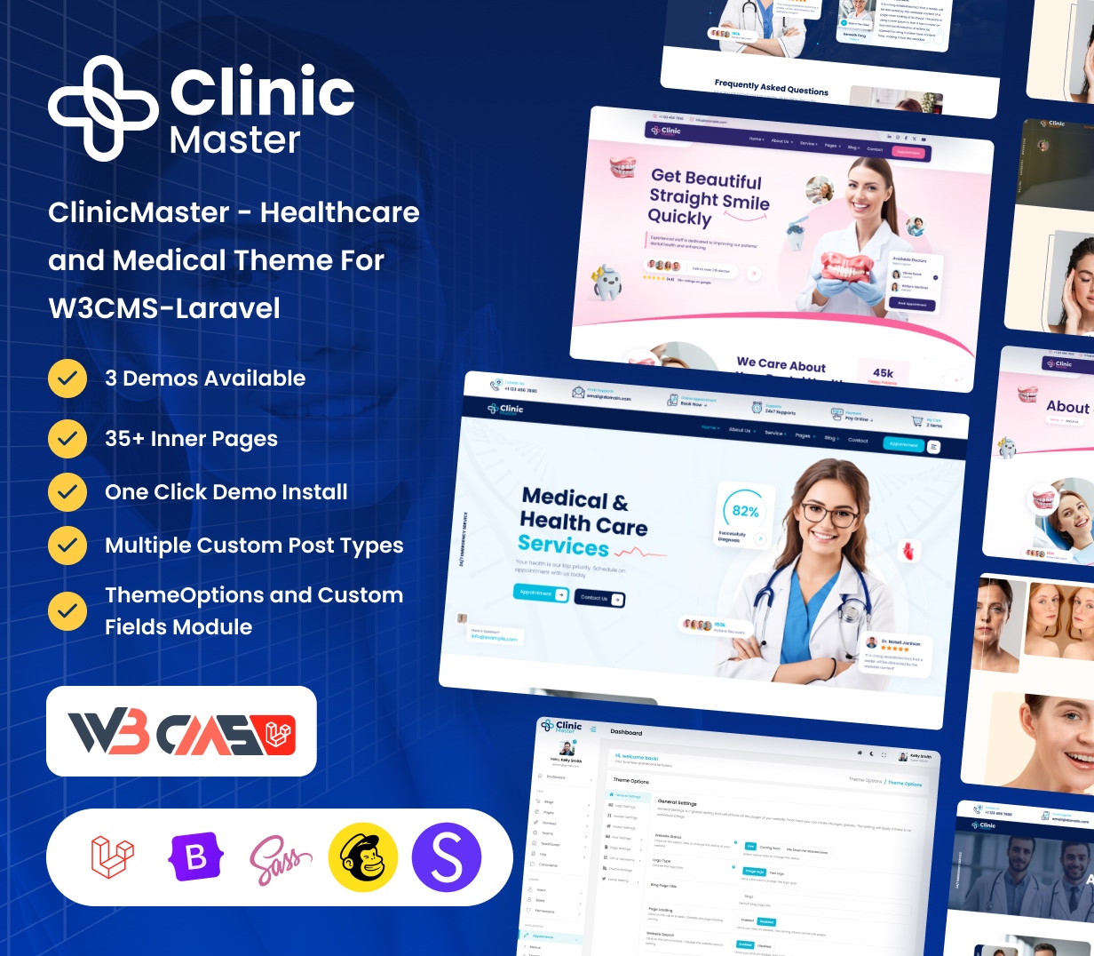 ClinicMaster is a premium, fashionable {and professional} Medical & Healthcare Theme constructed solely for the W3CMS-Laravel | Content material Administration System.